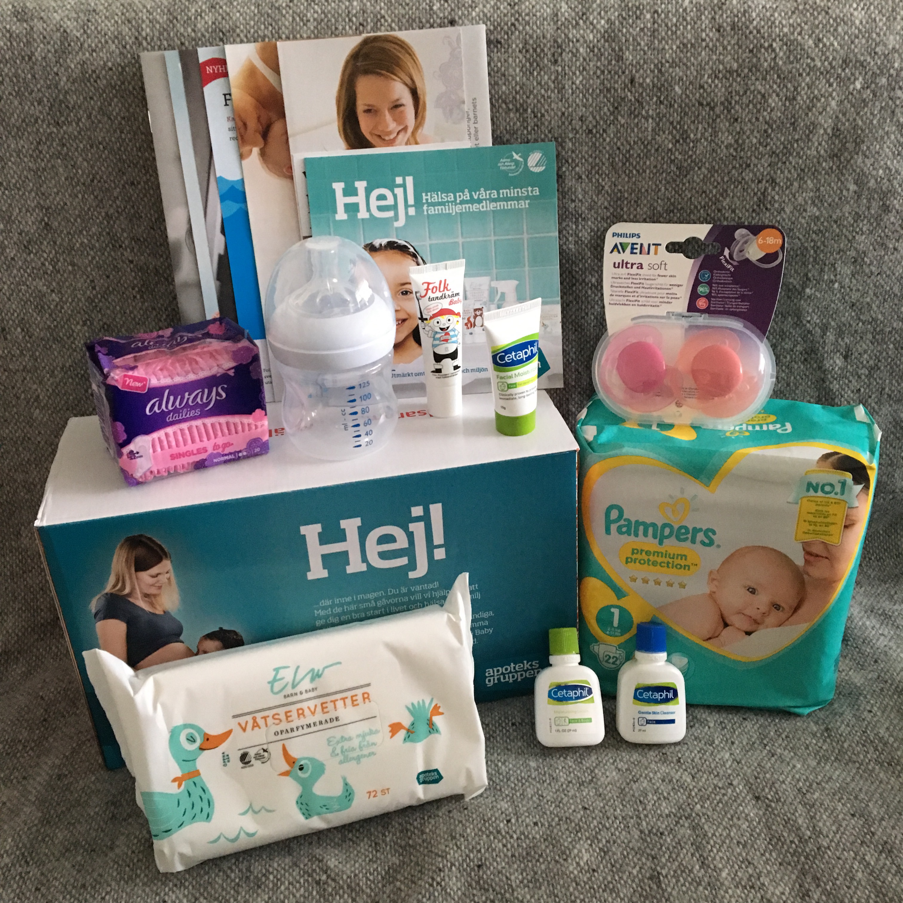 Gratis är gott brukar det ju heta! När man väntar barn finns en mängd olika så kallade babyboxar man kan få gratis, framför allt från olika apotek. Vi försökte skaffa alla vi kunde hitta och fick tag i alla utom en eftersom den butiken inte fanns ens i närheten av där vi bor. Det fanns information om hur man skaffar babyboxarna på många ställen (tex På babypaket.com) men däremot saknade jag att veta innan vad de skulle innehålla (för att veta om det kunde vara värt att åka långt eller springa runt till olika ställen för att hämta ut). Nedan presenteras innehållet som fanns i de olika boxarna vi hämta ut i februari 2019;