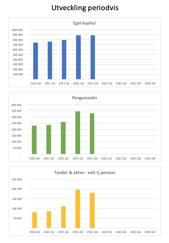 Min mall utgår ifrån att man sätter upp en balansrapport kvartalsvis – den sista dagen i respektive kvartal (alltså 31/3, 30/6, 30/9 och 31/12), men det går såklart att anpassa om man vill göra oftare eller mer sällan. En flik sammanställer många av siffrorna över tid för att man ska få en enkel överblick över utvecklingen, och för några av serierna har jag skapat diagram (se bilderna ovan): eget kapital, pengamaskinen, fonder & aktier (exkl tjänstepension), ekonomiskt fri i %, FIRE-nivå, samt trygghetsmånader.