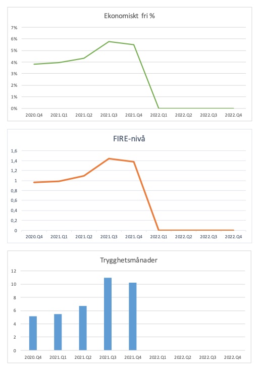 Diagrammen och siffrorna för ”Ekonomiskt fri %” samt ”FIRE-nivå” baseras på siffror du fyller i på fliken för balansräkningen där du anger hur mycket passiv inkomst du siktar på att din pengamaskin ska ge dig, och vilken ”säker” avkastning du räknar med (tänk 4%-regeln eller safe withdrawal rate). Ekonomiskt fri i % anger hur stor din pengamaskin är i förhållande till målet. FIRE-nivån räknar istället hur många gånger större din pengamaskin är än dina årliga utgifter (=önskade passiva inkomsterna). Jag tyckte den var intressant att följa eftersom man ju ibland pratar om t.ex. Flamingo-FI vilket är när man nått halvvägs till normal FIRE som ju är 25 gånger årliga utgifterna. Månader av trygghet är istället hur långt dina likvida medel och korta placeringar skulle räcka (givet den utgiftsnivå du har angivit) om du måste använda upp pengarna.
