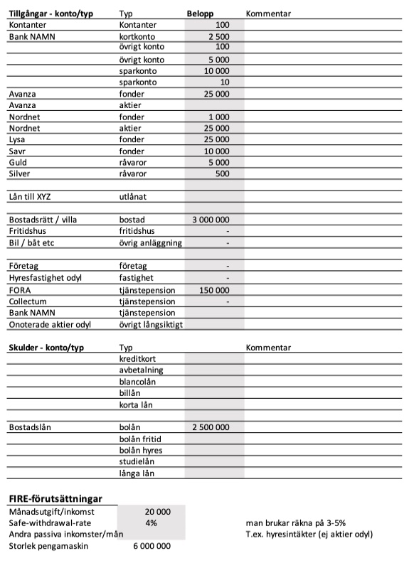 Sedan jag förstod vitsen med att sätta ihop en privatekonomisk balansräkning för några år sedan har jag då och då letat efter en bra mall. Jag lyckades aldrig hitta någon mall så nu tog jag tag i saken och skapade en egen som jag tänkte dela med mig av här – hoppas någon kan ha nytta av den! Låna, sno, ändra så mycket du vill. Kom gärna tillbaka hit och lämna feedback och förbättringsförslag! 🙂